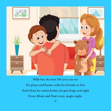 Billy has the best life you can see He plays and learns with his friends so free And when he comes home, he gets hugs real tight From Mom and Dad every single night. 10