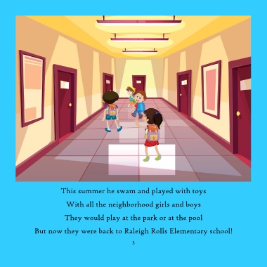 This summer he swam and played with toys With all the neighborhood girls and boys They would play at the park or at the pool But now they were back to Raleigh Rolls Elementary school! 3