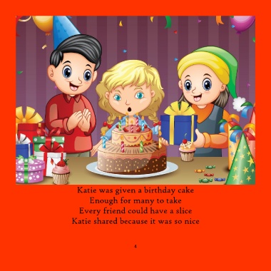Katie was given a birthday cake Enough for many to take Every friend could have a slice Katie shared because it was so nice 4
